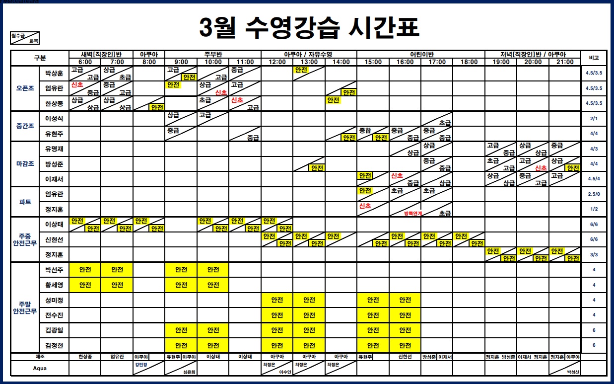 3월 수영 강습 시간표