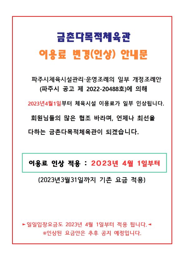 금촌다목적체육관 이용료 인상 안내문