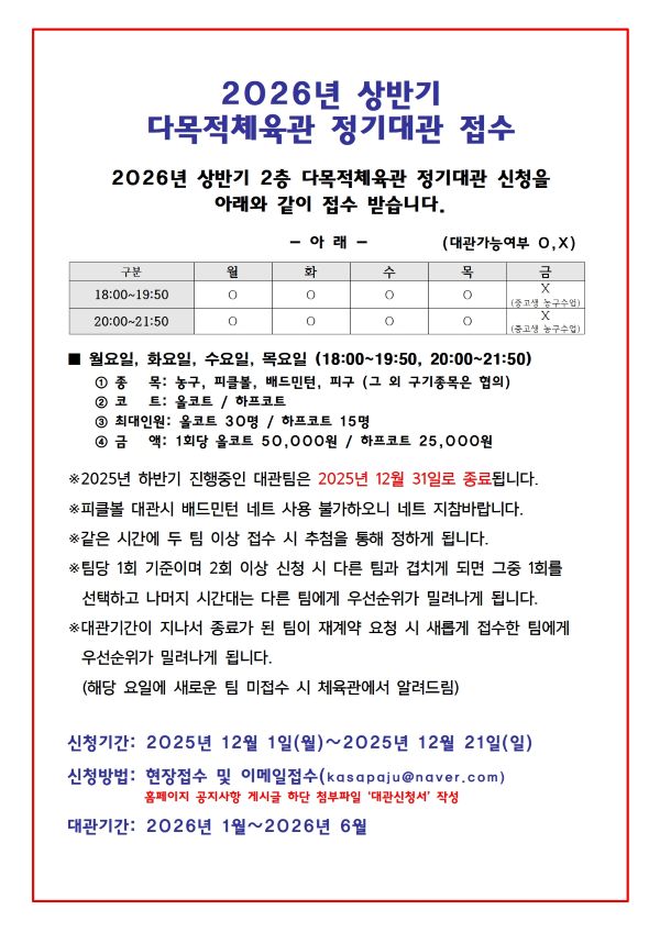| 2026년 상반기 2층 다목적체육관 정기대관 접수일정2025-12-01 | |||