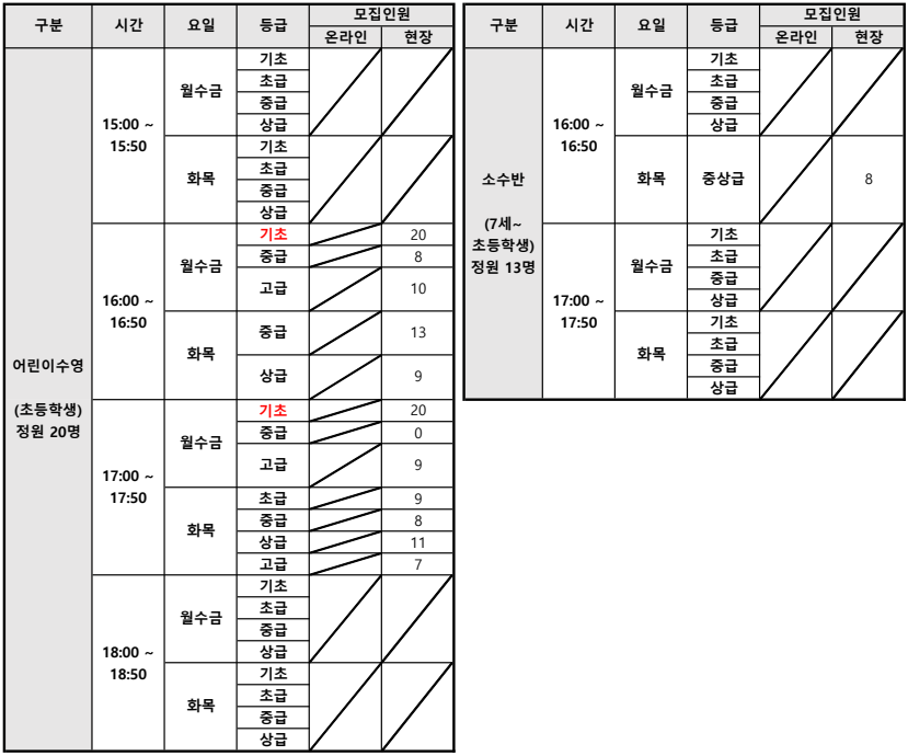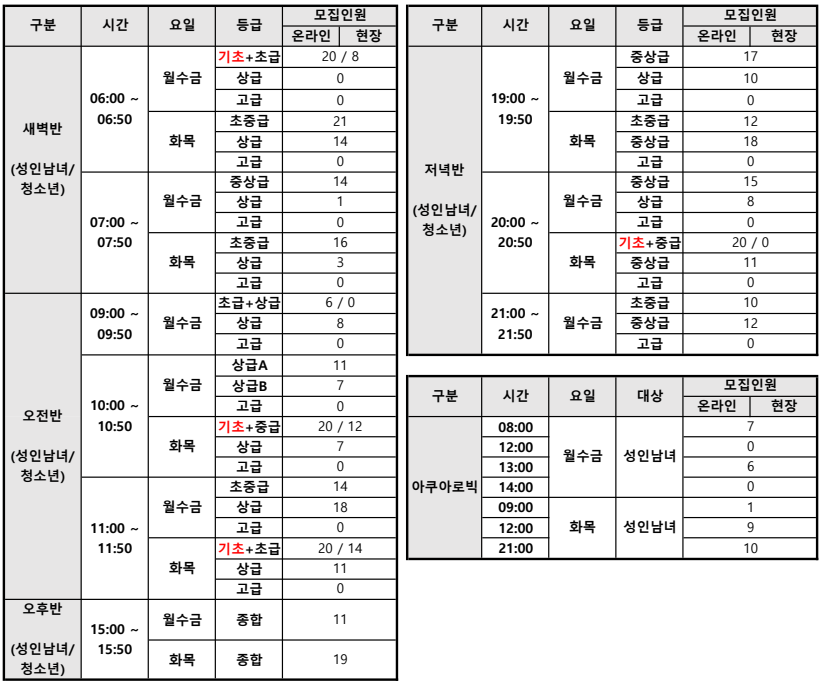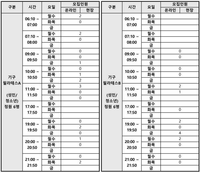 <신규회원 모집안내> * 온라인 접수는 12월 26일 06시~22시 하루만 가능합니다. (중학생 14세부터 접수) * 현장 접수는 12월 26일 06시~ 12월 31일 22시까지 가능합니다. * 수영 소수반, 수영 어린이반, 농구는 현장접수 바랍니다. * 수영등급기준: 기초-입문 과정 / 초급-자유형 가능자 / 중급-자유형, 배영 가능자 / 상급-자유형, 배영, 평영 가능자 / 고급-4가지 영법 가능자 고급반은 신규등록이 불가합니다. 상급반에서 승급을 통해 변경됩니다. 등록 시 등급에 맞지 않으면 환불조치 합니다. * 아래는 1월 모집인원 수 입니다. * 정원 미달 시 폐강될 수 있습니다. ▶ 수영, 아쿠아로빅 프로그램 ![]() ![]() ▶ 기구 필라테스 프로그램 ![]() ▶ GX 프로그램 ![]() ![]() |