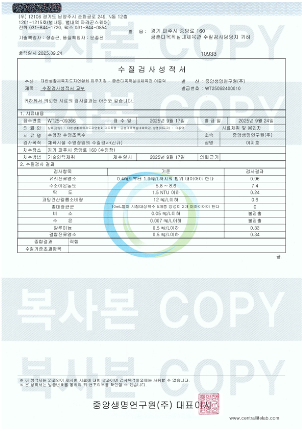 금촌다목적실내체육관 수영장 수질검사 결과 안내(25.09.17)