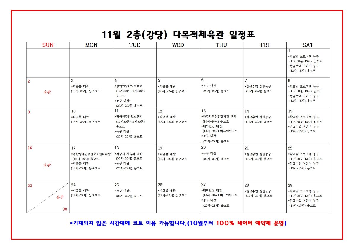 2025년 11월 2층 다목적체육관 일정표