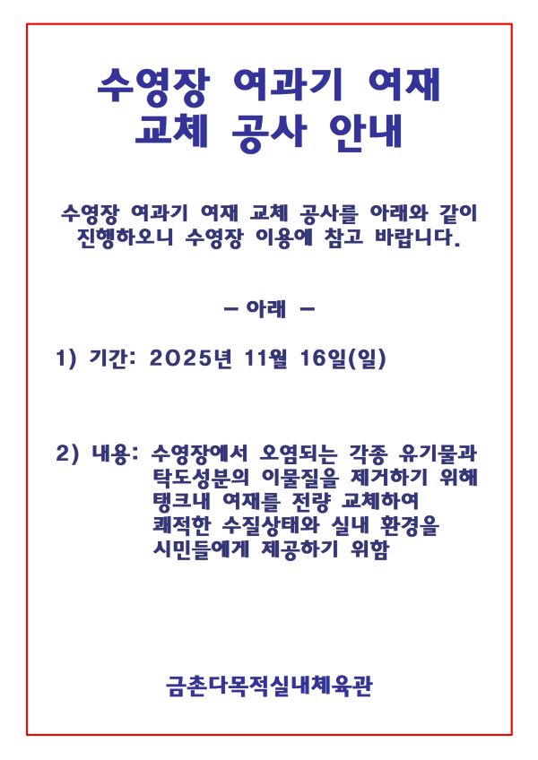 게시글(수영장 여과기 여재 교체 공사 안내) 상세내용