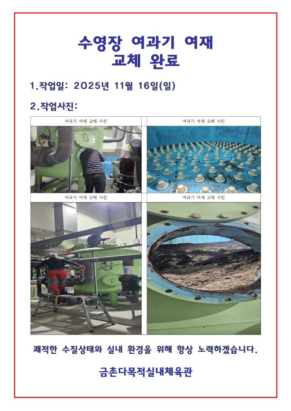 게시글(2025년 11월 16일(일) 수영장 여과기 여재 교체 완료) 상세내용