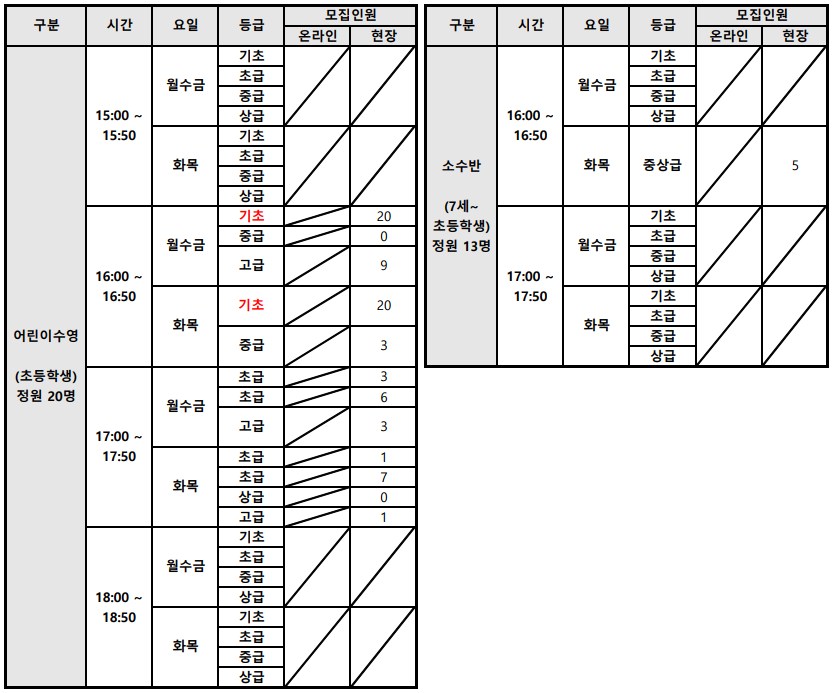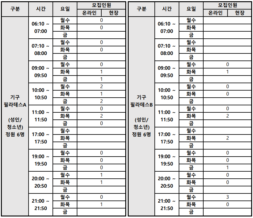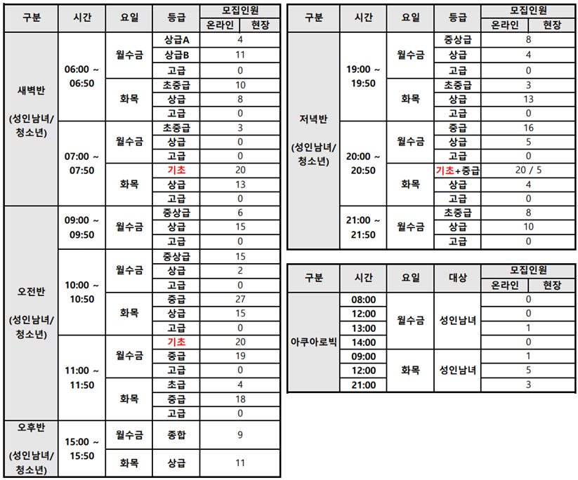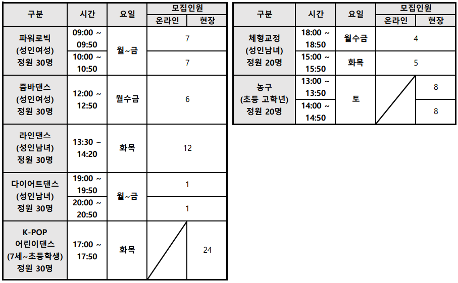 <신규회원 모집안내> * 온라인 접수는 08월 25일 06시~22시 하루만 가능합니다. (중학생 14세부터 접수) * 현장 접수는 08월 25일 06시~ 08월 30일 22시까지 가능합니다. * 수영 소수반, 수영 어린이반, Kpop어린이댄스, 농구는 현장접수 바랍니다. * 수영등급기준: 기초-입문 과정 / 초급-자유형 가능자 / 중급-자유형, 배영 가능자 / 상급-자유형, 배영, 평영 가능자 / 고급-4가지 영법 가능자 고급반은 신규등록이 불가합니다. 상급반에서 승급을 통해 변경됩니다. 등록 시 등급에 맞지 않으면 환불조치 합니다. * 농구 강습은 9월 전체 휴강으로 첫강습일은 10월 4일(토) 입니다. (공지사항 게시글 '2025 9월 2층 다목적체육관 일정표' 참고) * 아래는 9월 모집인원 수 입니다. * 정원 미달 시 폐강될 수 있습니다. ▶ 수영, 아쿠아로빅 프로그램 ![]() ![]() ▶ 기구 필라테스 프로그램 ![]() ▶ GX 프로그램 ![]() ![]() |