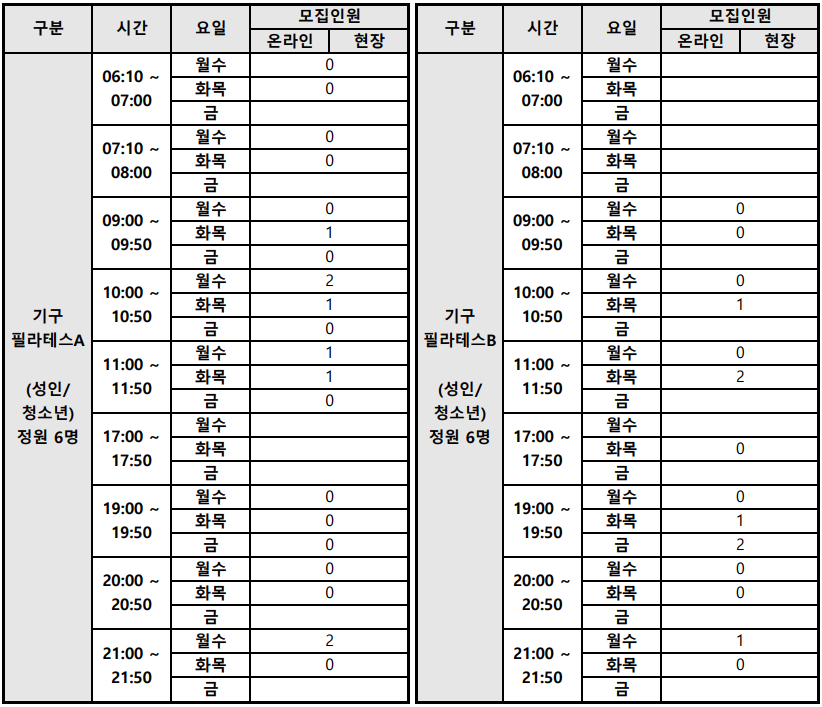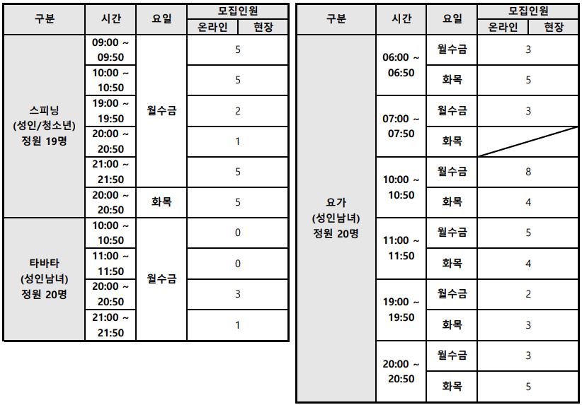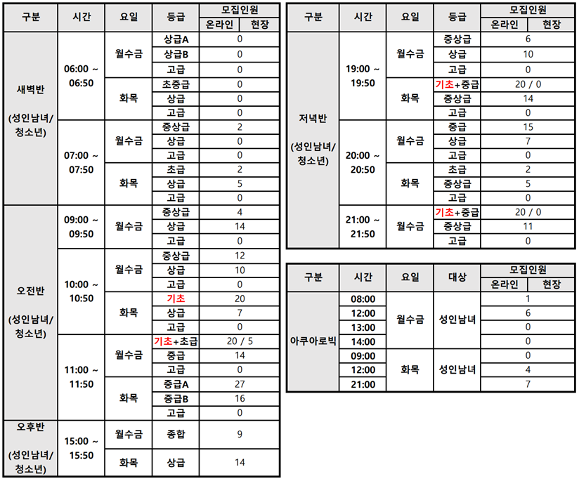 <신규회원 모집안내> * 온라인 접수는 09월 25일 06시~22시 하루만 가능합니다. (중학생 14세부터 접수) * 현장 접수는 09월 25일 06시~ 09월 30일 22시까지 가능합니다. * 수영 소수반, 수영 어린이반, Kpop어린이댄스, 농구는 현장접수 바랍니다. * 수영등급기준: 기초-입문 과정 / 초급-자유형 가능자 / 중급-자유형, 배영 가능자 / 상급-자유형, 배영, 평영 가능자 / 고급-4가지 영법 가능자 고급반은 신규등록이 불가합니다. 상급반에서 승급을 통해 변경됩니다. 등록 시 등급에 맞지 않으면 환불조치 합니다. * 수영 06시 반은 신규회원을 받지 않습니다. (신규 기초반 개설을 위해 인원 조정중) * 아래는 10월 모집인원 수 입니다. (24일 반변경으로 인해 모집인원수 변동 있을 수 있음) (모집인원 1명 강습반은 전화 문의가 정확합니다) * 정원 미달 시 폐강될 수 있습니다. ▶ 수영, 아쿠아로빅 프로그램 ![]() ![]() ▶ 기구 필라테스 프로그램 ![]() ▶ GX 프로그램 ![]() ![]() |