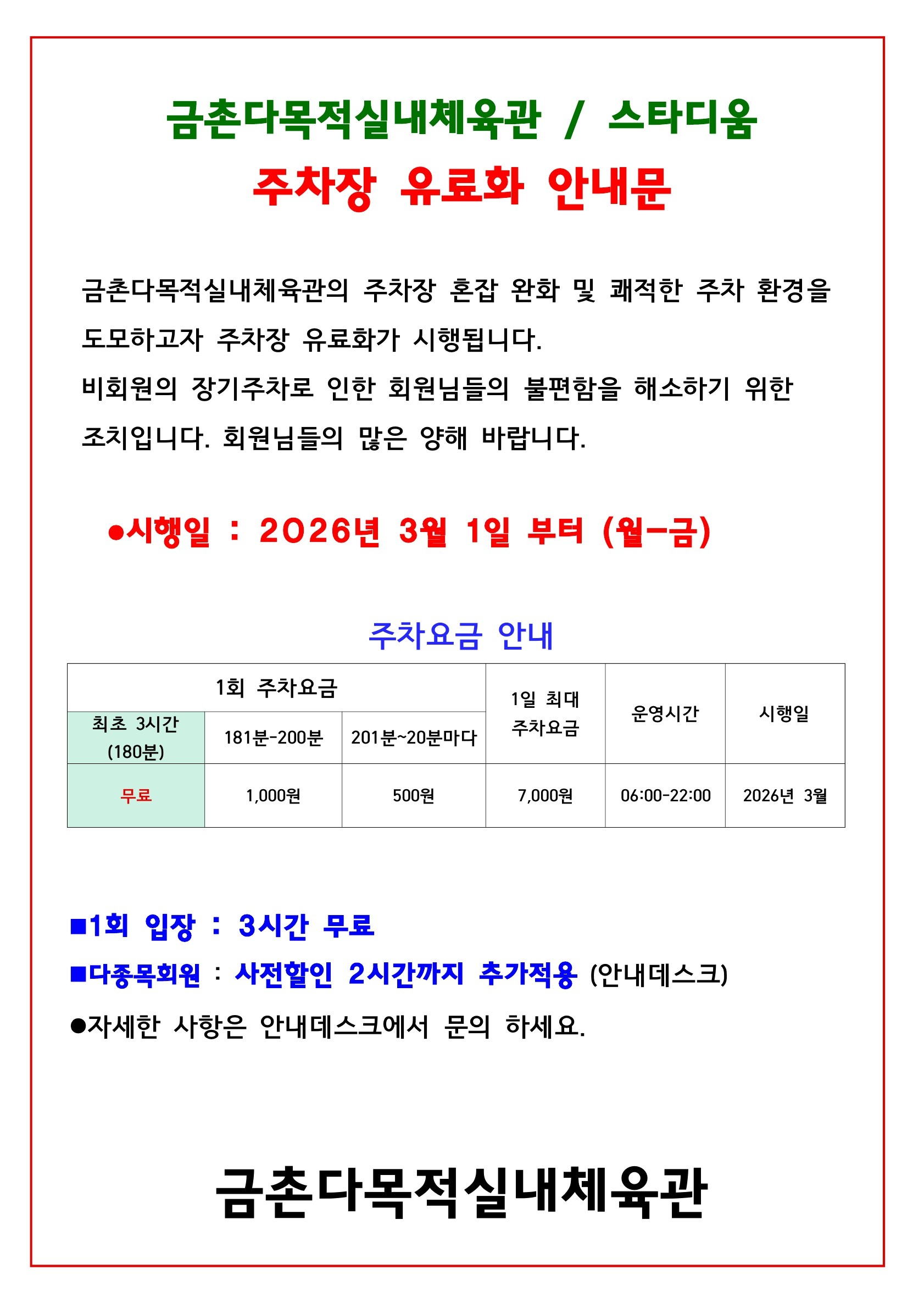 금촌다목적실내체육관/스타디움 주차장 유효화 안내