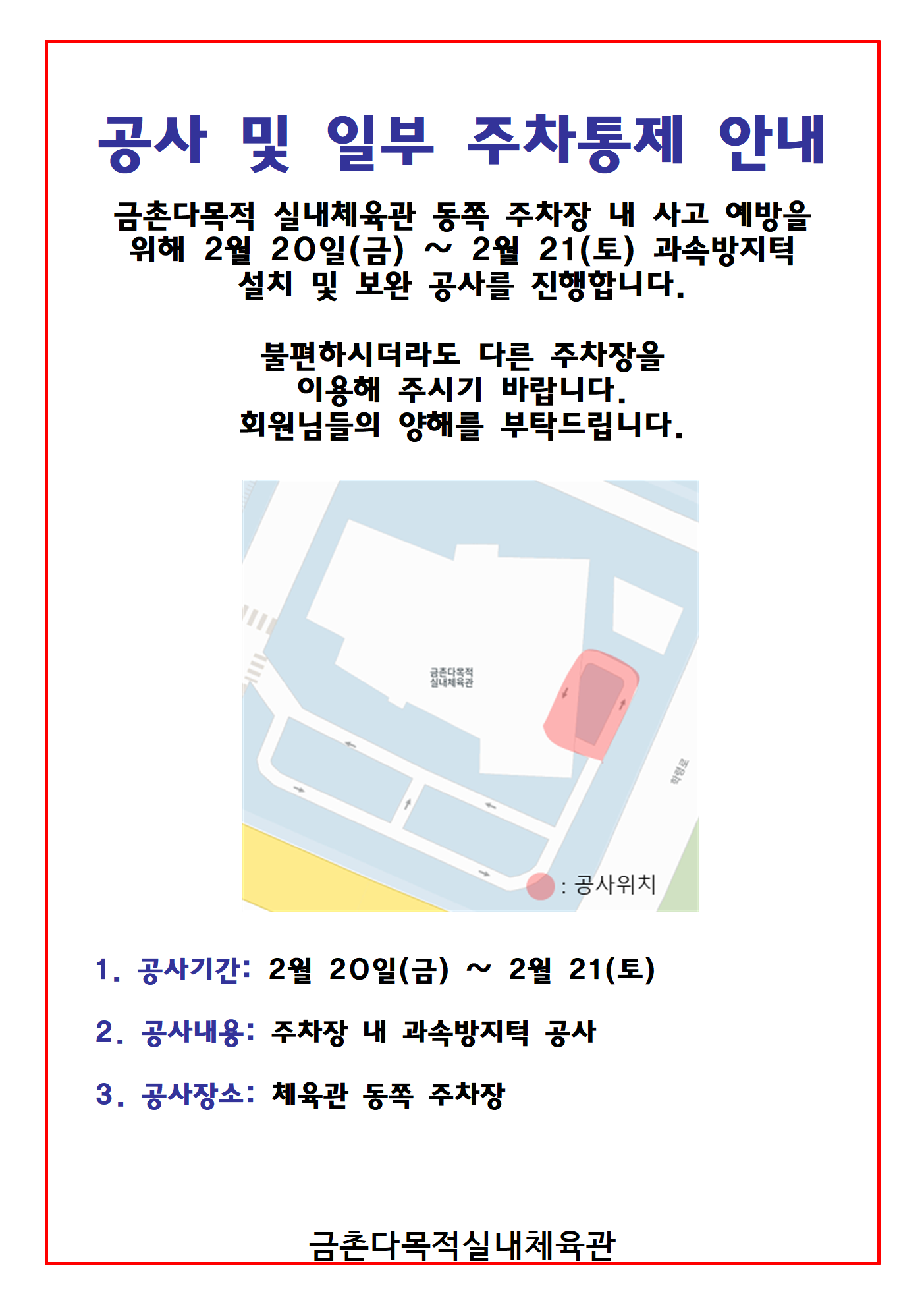 공사 및 일부 주차통제 안내(체육관 동쪽 주차장)